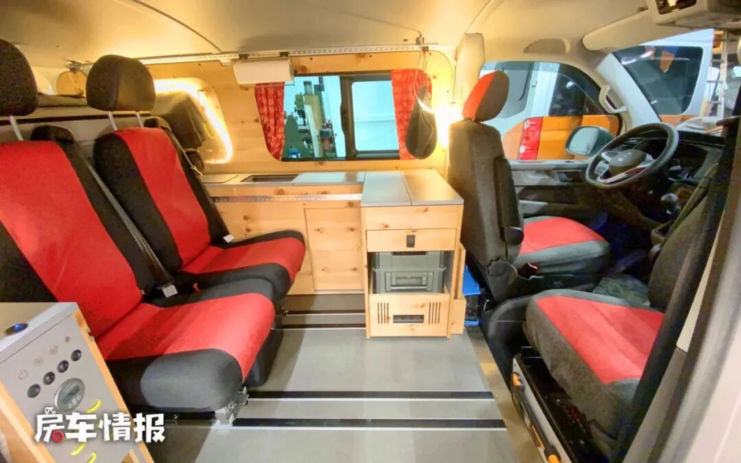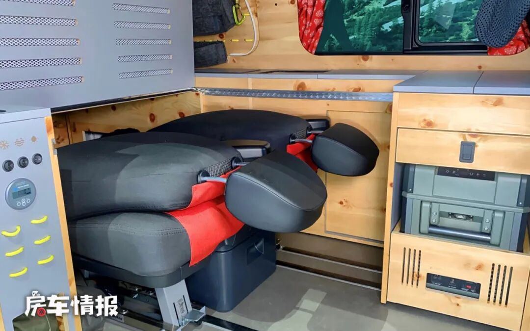 进入车厢内部,可以看到整车的内饰十分简单,天然木质板材,没有过多的装饰,这点实在有些尴尬,座椅也都采用的黑色皮质拼红色布艺的形式,前方驾驶室的副驾驶座椅可整体旋转面向后方,和后方的两把座椅组成了一个简易的会客区,主驾驶座椅后面的箱体可以抽拉出来变成一个简易的餐桌,下方还提供一些储物抽屉,但不得不说这也太简朴了,更像是在野生的木屋里。