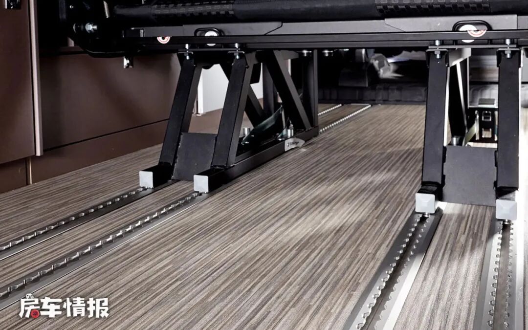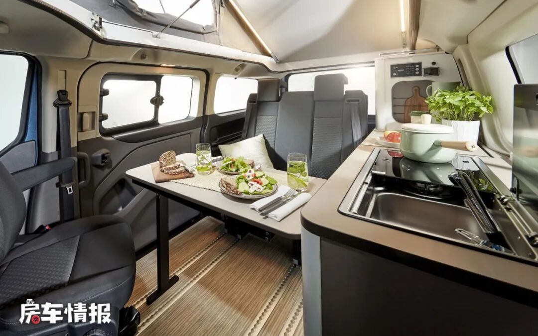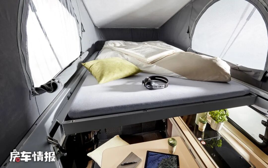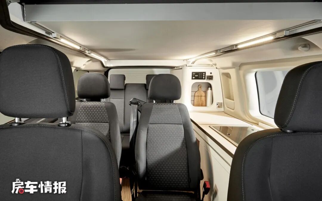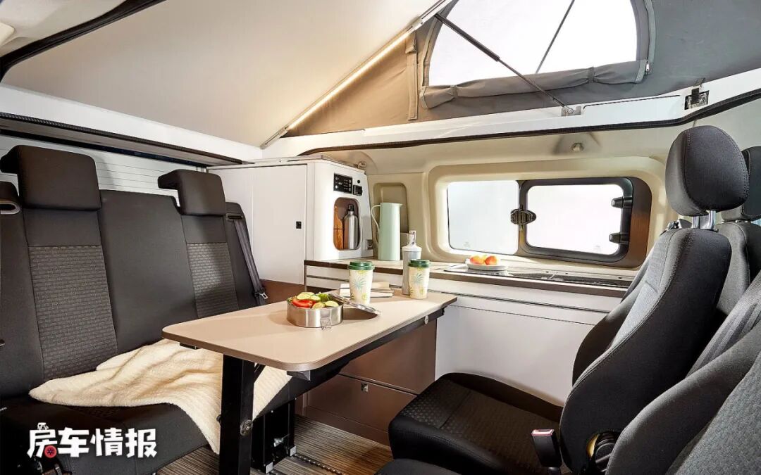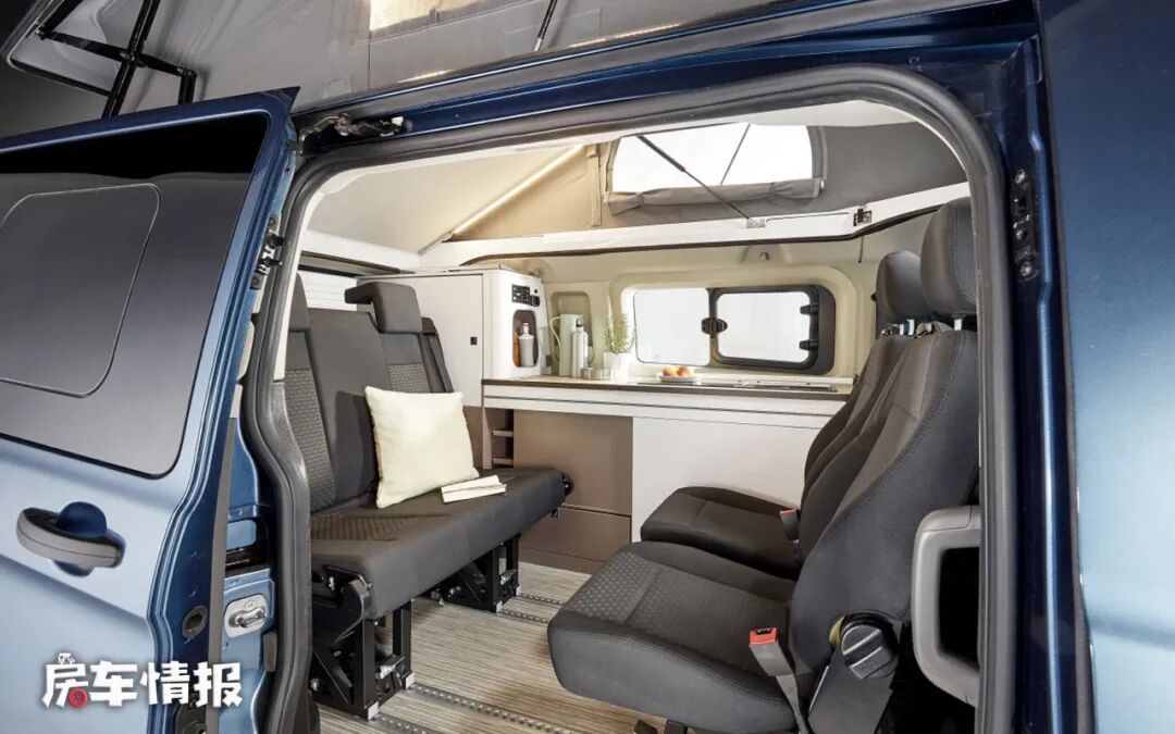 另外,这款房车的前后两排座椅底下都带有滑轨,白天行车的时候可以坐人,如果后期选配了可旋转的驾驶座椅,那么晚上则可通过滑轨将座椅旋转与后排座椅拼接成一张尺寸为187*97(mm)的双人床铺,加之升顶帐篷内尺寸为190 *110(mm)的双人床,这样最多可以容纳四个人休息。