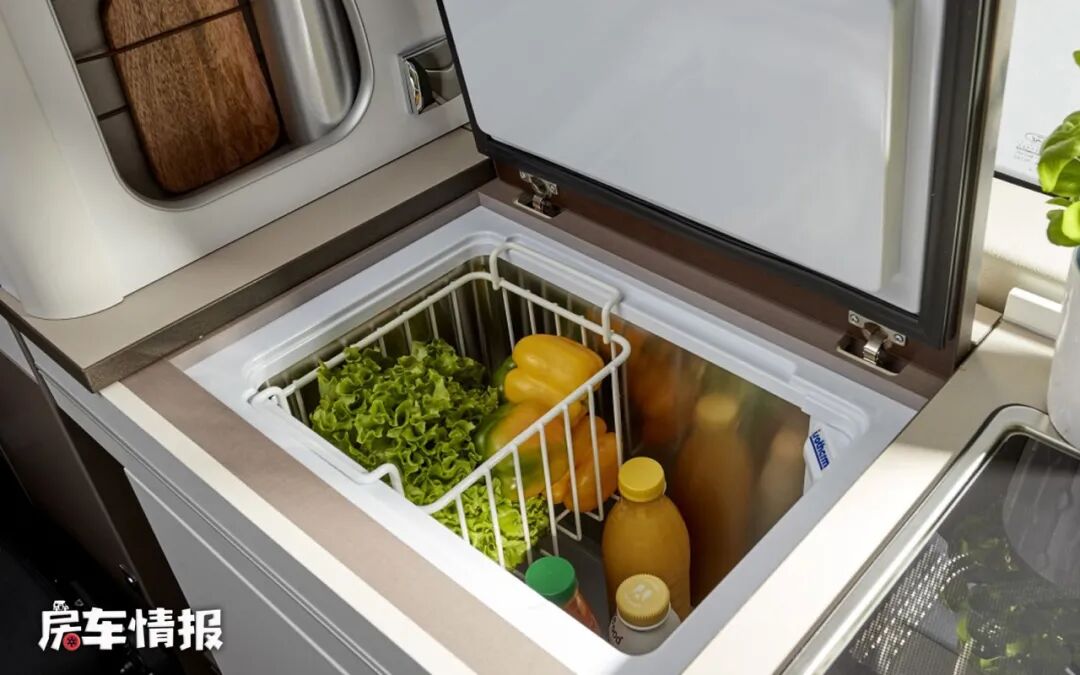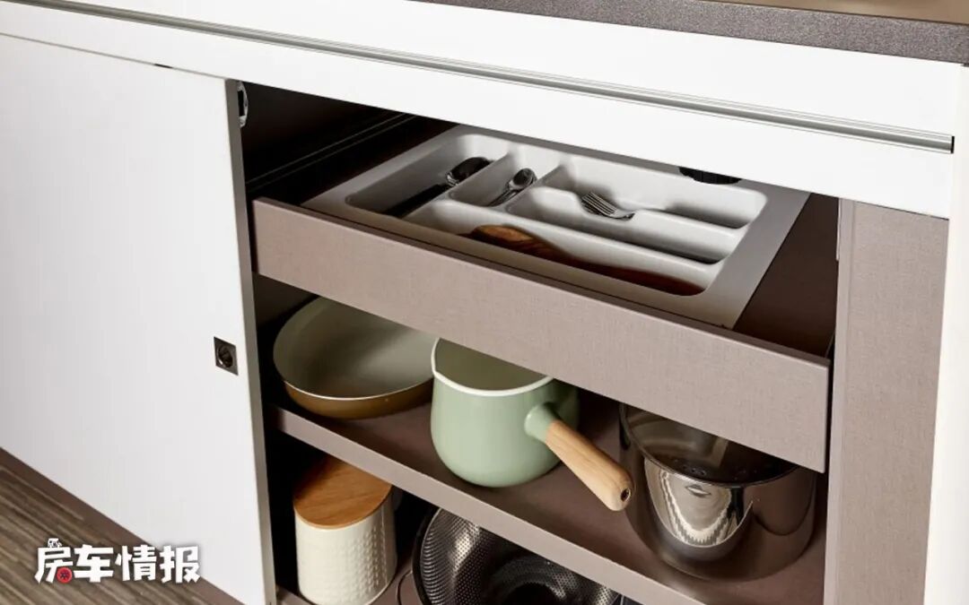 下方的储物柜采用的是推拉门式,这种设计非常的节省空间,而最左侧还提供了一个上下贯通的高层储物柜,在最大限度上加大了储物空间,需要注意的是,厨房区是固定在车厢内部的,不能自行拆除。