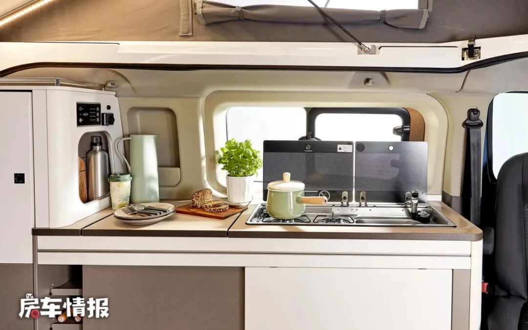 车厢左侧是由一排橱柜组成的厨房区,整体台面尺寸都还不错,提供一个双燃气灶炉和一个水槽,水槽平时可洗菜也可以充当洗漱台。左侧是一块空白的台面,平时可以放置物品,也可以充当菜板,如果后期有需要,还可以加装一台41L的上翻盖式冰箱。