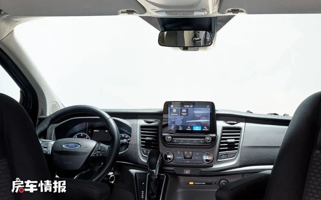 驾驶室内部依旧采用了福特全顺一致的设计风格,全黑的中控台,配备了多功能方向盘和一个可操控的彩色显示屏。