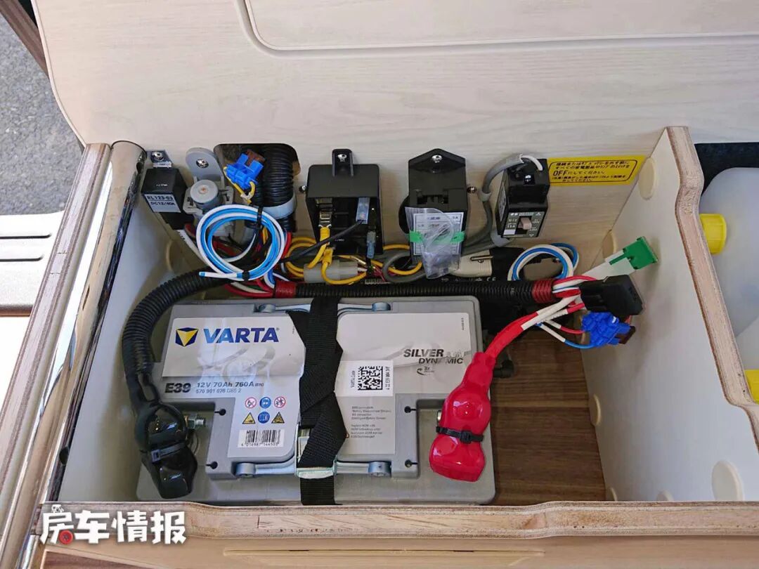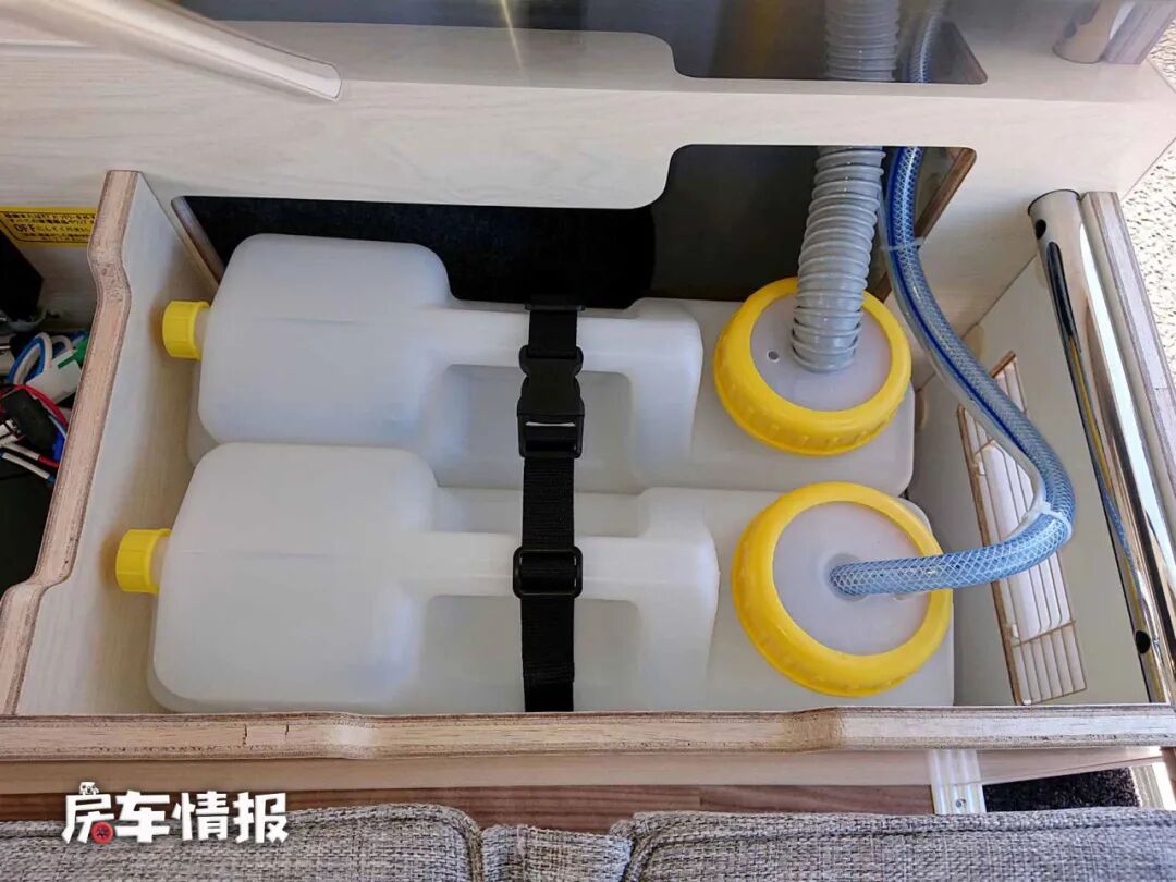 最后说一下这辆车的水电,这款房车搭载了一台70Ah AGM子电池,提供DC12V的插座和多个LED照明设备。另外整车还提供了10L的净水箱和10L的废水箱,还是可以满足两个人的出行用水需求的。