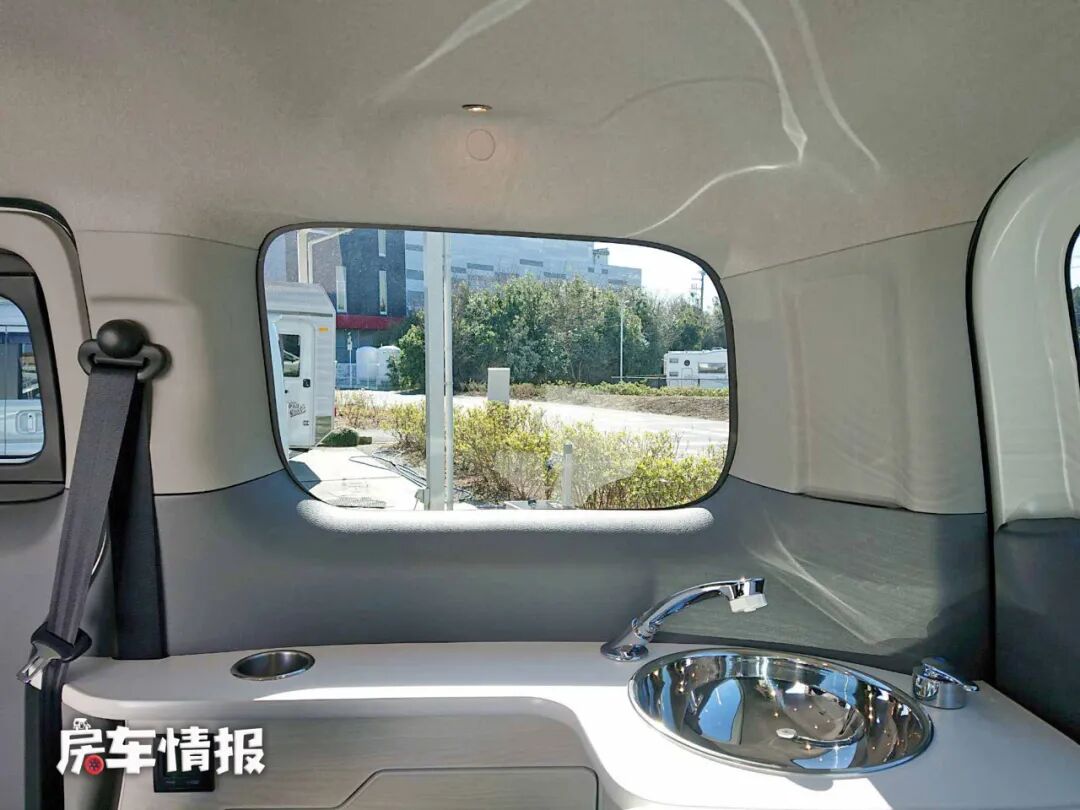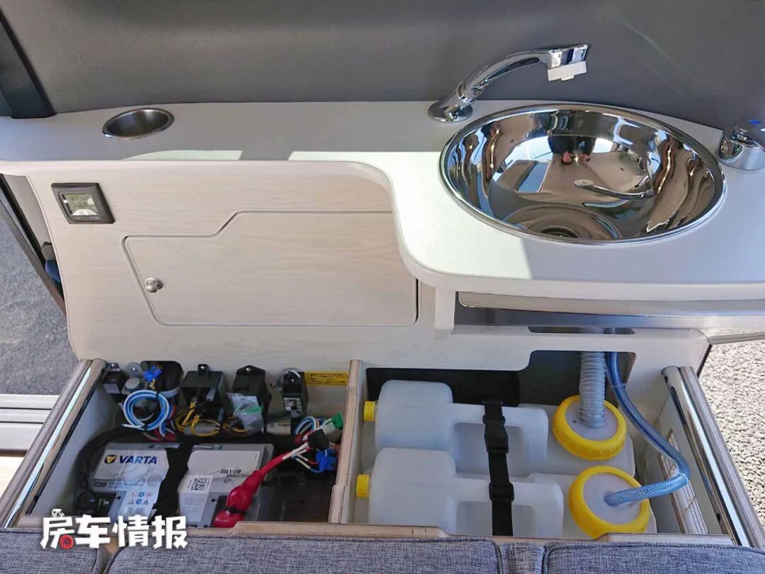 车厢右侧的设计类似左侧,不同的是靠近尾门的杯托变成了洗手水槽,水龙头平时放在台面上可以洗手洗菜,需要时可以拽出来变成淋浴喷头。左侧杯托下方的储物柜变成了普通的拉开门式,虽然内部空间能合理利用,但是这种打开式的柜门也不是很完美的设计。