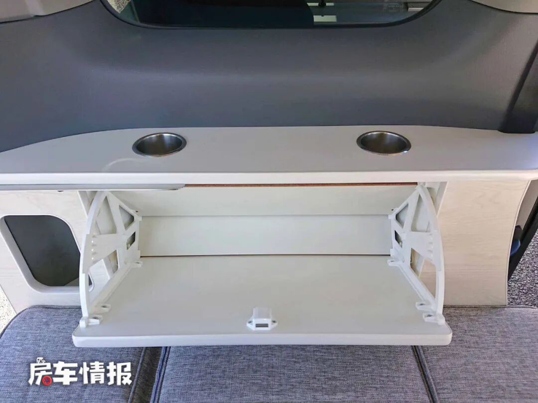 而车尾部的大尺寸桌板也可以拆卸下来,移到前方沙发座椅处,所以说整车的内部设计就像积木一样,可以按照自己的需求喜好组装,不仅提高了设计的人性化,也增加了房车改造的乐趣性。