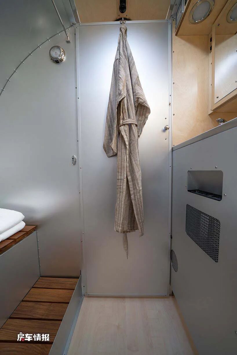 继续往后走就到了这款拖挂房车的卫浴区,左侧是内含一个马桶的单独卫生间,右侧是洗漱间,提供了洗手池、梳妆镜、储物柜、淋浴喷头等设施,足够满足出行的洗漱需求。
