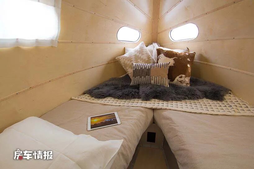 最后是整车的休息区,因为外观的尖头收尾设计,所以休息区的两张单人床铺以V字形摆放的,有需求的时候也可以合成一张双人床,空间还是不错的。