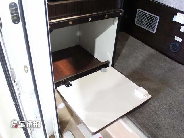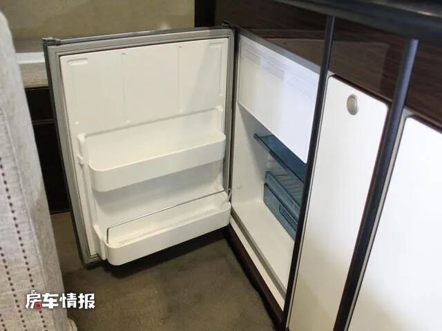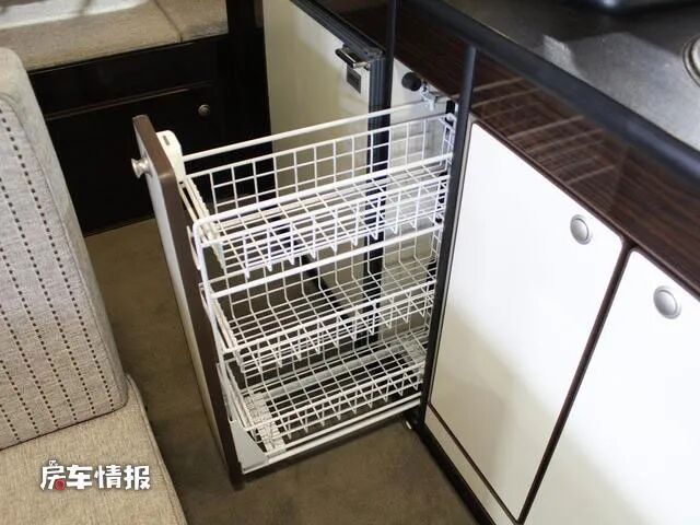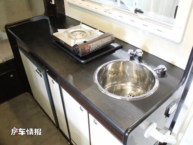 乘客门的右侧是厨房区,料理台面还是很大的,右侧是一个洗菜池,中间是一个便携式电磁炉,左侧是空白的台面,平时可以在这里切菜准备食材,下面提供了多个储物柜,最特别的是有一个竖排的夹缝收纳抽屉,可以放一些瓶瓶罐罐,提升了行车的安全性。除此之外左下角还放置了一台64L的冰箱供平时使用,设备还是很齐全的。