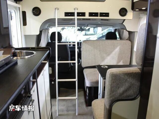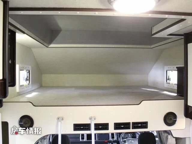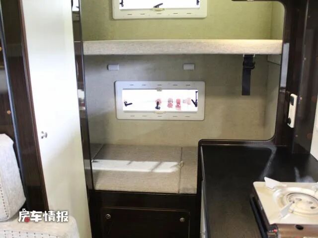 尾部的休息区是由上下横置的子母单人床组成的,上下床铺的尺寸均为780* 1990(mm),可以睡两个成年人,上层床铺也可以拆卸下来增大下面的使用空间,下面的床垫也可以拆卸,直接连通车尾部的行李储物箱,拿取东西还是很方便的。加上额头内部的尺寸为1800* 1980(mm)的三人额头床,以及卡座拼成的双人床,一共可容纳七个人休息。