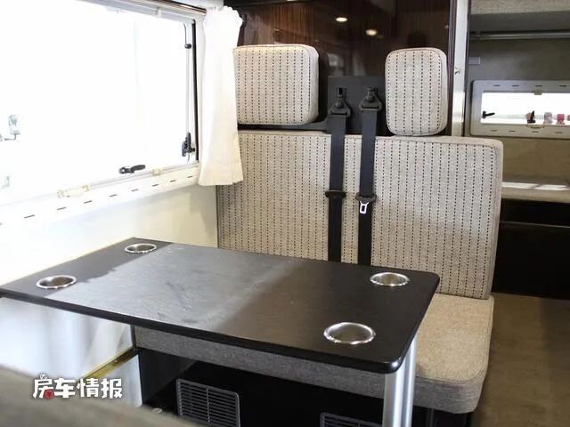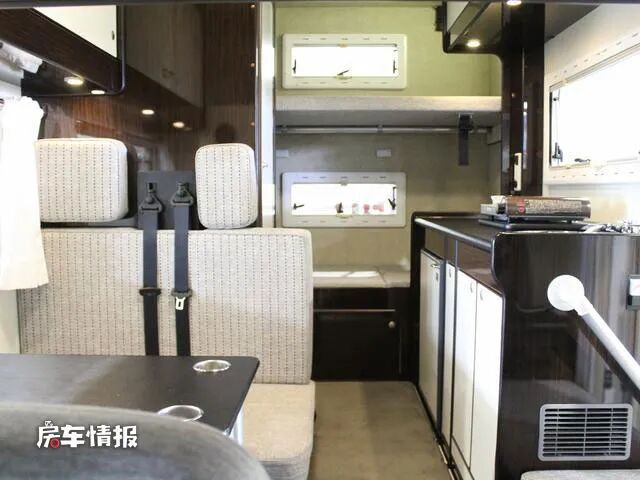 乘客门左侧提供了一排小鞋柜,尺寸虽然不大,但是设计很合理也很人性化。正对门的是会客区,由两排对坐式布艺沙发和一张可升降的餐桌组成的,面向前方的一排沙发带有两个安全带,平时行车时也是可以坐人的。虽然整体的色调比较偏暗,但是空间感还可以,