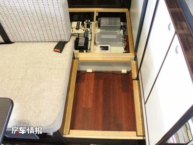 整车还有一个有意思的设计是,地板底下是储物箱,包括沙发底部都带有可以储物的箱体,储物空间还是非常大的,设计也很特别。