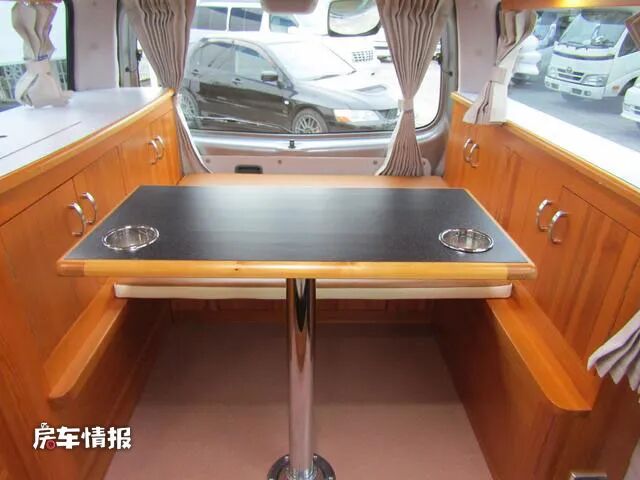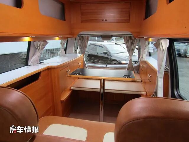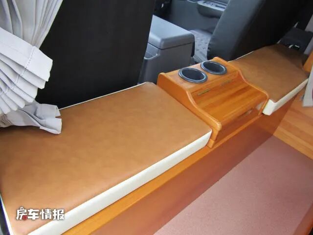 从车身左侧的乘客门进入车内的生活区,可以看到生活区的装潢风格和驾驶室完全不同,全部采用了深棕色。