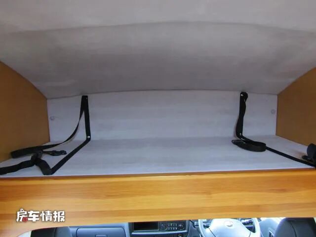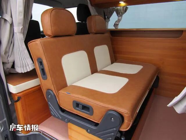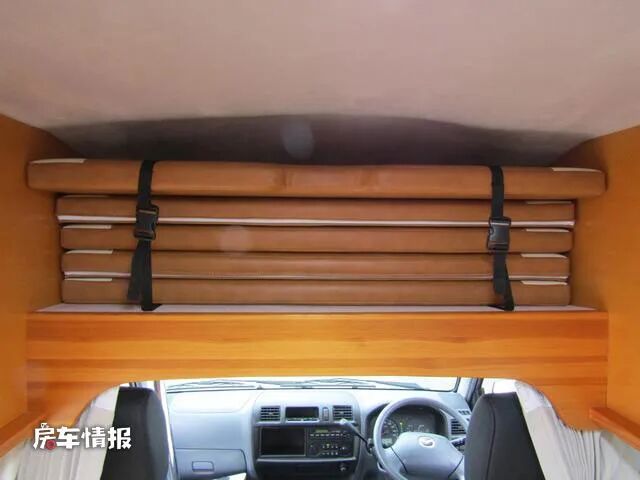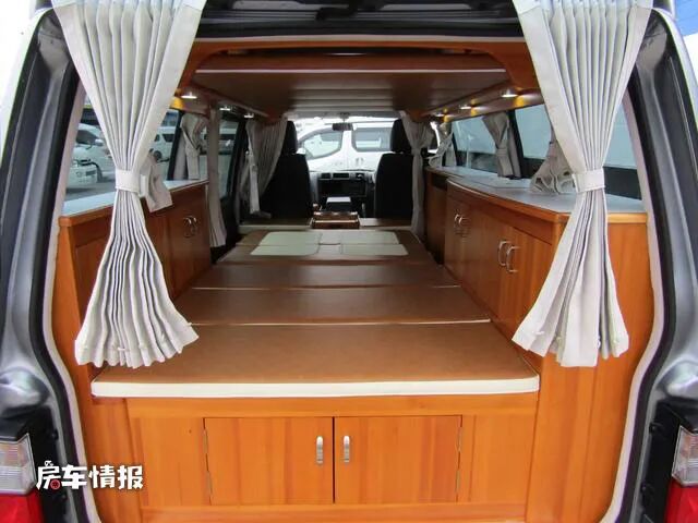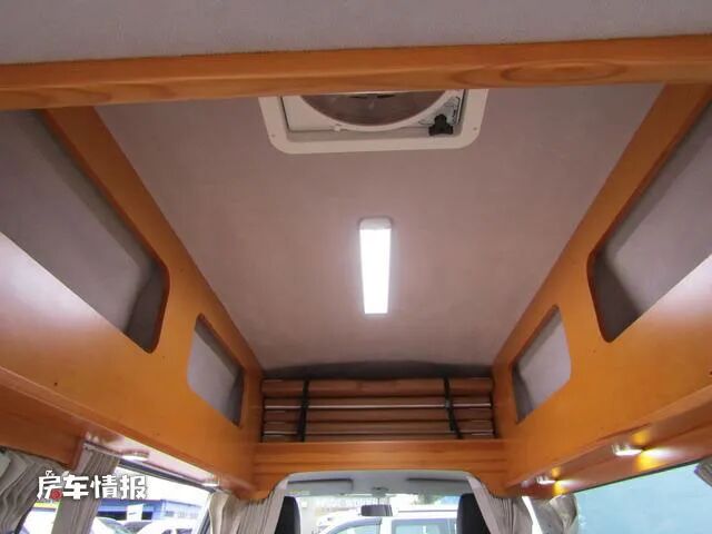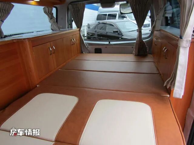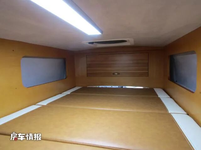 上层床铺在白天的时候很巧妙的隐藏在了车顶内部,晚上将床垫可以组合成一张1900*1000(mm)的双人床,也足够两个成年人睡觉休息使用。