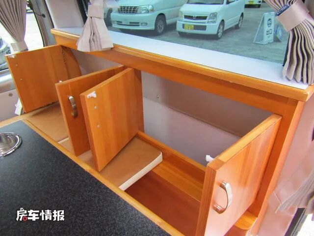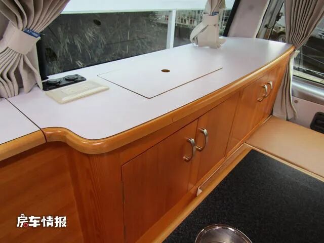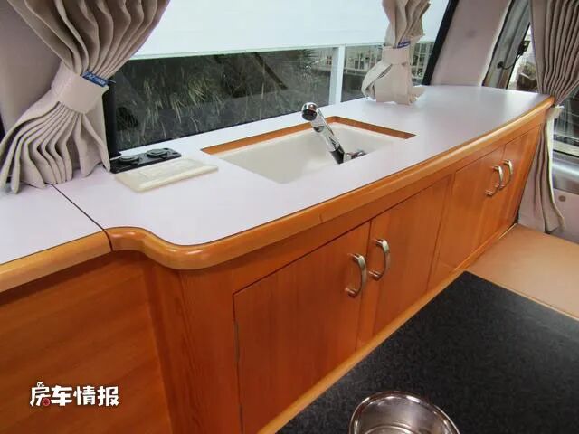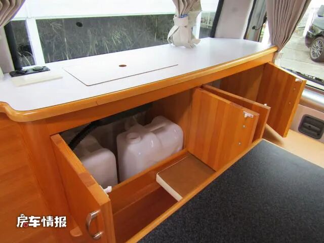 车厢内部的左右侧各提供了一排储物柜,左侧储物柜上面提供了一个开盖式的水槽,里面的水龙头可以折叠,平时不用的时候就盖上盖板充当一个台面,空间也非常的大,其实在这个位置放上电磁炉也能制作一些简餐。下面储物柜的空间也还不错。
