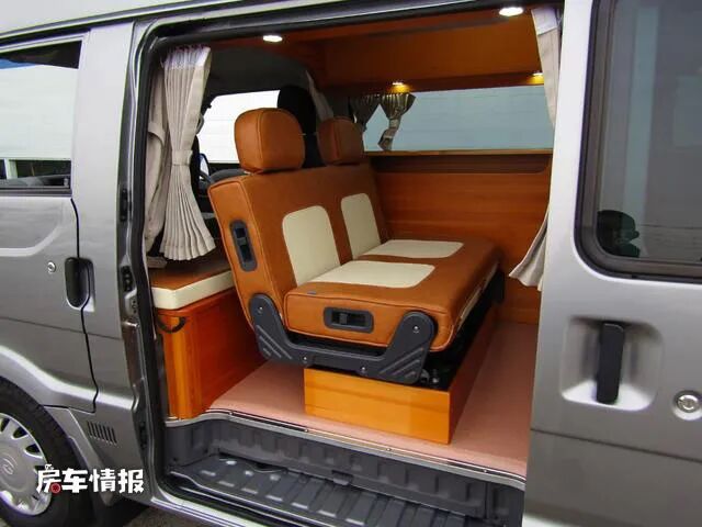 内部最大的亮点是提供了双层床铺,尾部的床垫和前排会客区放倒的座椅可组成一张2050*1000(mm)的双人床铺,供两个成年人休息完全够用。