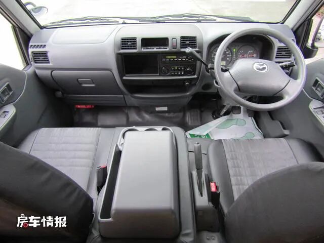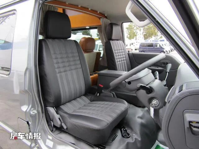 驾驶室依旧沿用了原车的设计风格,没有太大的变化,全黑色的中控台配全黑色的驾驶室座椅,中控台配备了一台小型的显示屏便于后期操作。因为主副驾驶座椅中间有一个大尺寸的扶手箱,所以驾驶室区域和后面的生活区不是贯通的。