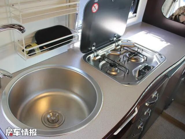 厨房区在会客区对面,有一个很宽大的操作台,设有不锈钢水槽、双口燃气灶、90L冰箱以及储物空间,厨具很齐全,可以在车内尽情施展厨艺,品尝美食。