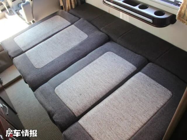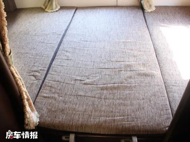 车尾部的双人床尺寸为1400*2000mm,虽然窄了一些,但是也足够两名成年人的睡眠空间了,床垫分为三部分,方便拆洗,也很厚实,躺在上面不会不舒服,床旁边还有窗户,既可以为内部通风换气,也可以增加亮度。