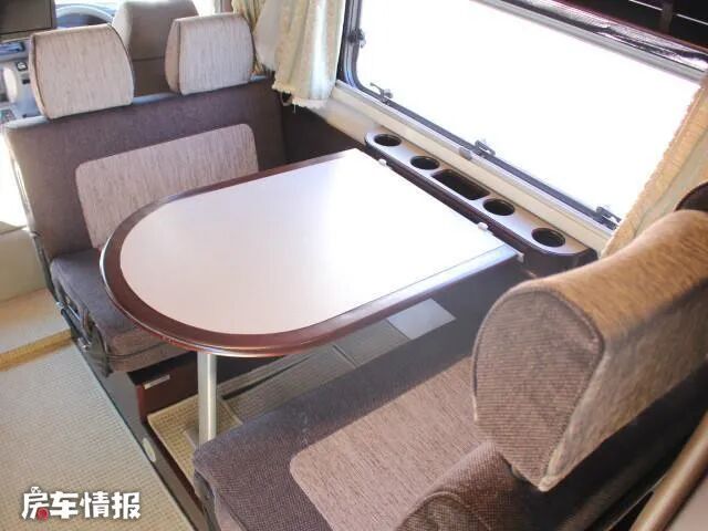 会客区在驾驶室后方,由一张可升降餐桌和一个对坐式沙发卡座组成,可以坐4人,旁边有一扇外推窗,坐在车内就就可以欣赏车外的景色,还设有一层窗帘,保护车内的隐私,窗台边有放置水杯的凹槽以及置物槽,防止物品的掉落。上方还有多个置物吊柜,可以放置出行时的行李。