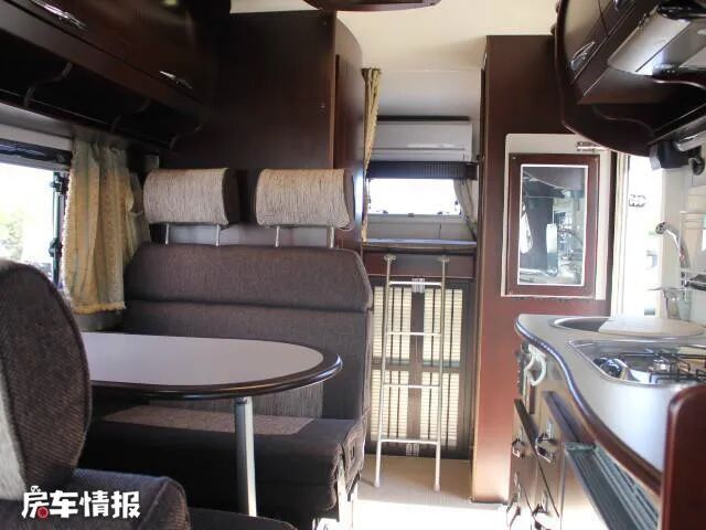 生活区内采用常规设计,大面积使用棕色和白色装饰,由前到后依次为额头床、会客区、厨房区、卫生间以及后置横床,与其他房车较为不同的是这款房车的侧门在车尾部,这样就为前面的区域提供了更大的空间。