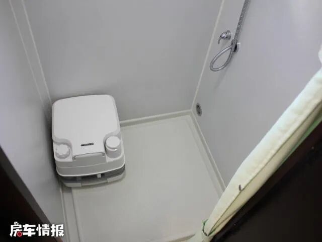 卫生间内空间很宽裕,装有一个盒式马桶、淋雨装置以及防水帘,由于外面有洗手池,所以在卫生间内就没有安装,不过这也节省了很大的空间,在洗澡的时候会很方便。