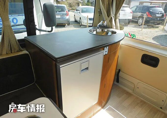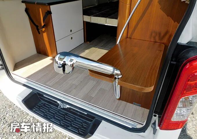 除此之外,橱柜的右侧还有一个可翻折的小桌板,需要的时候可以打开,洗菜池中的水龙头可拉抻到车外作为外置的淋浴喷头使用,整体还是非常的合理和人性化的。