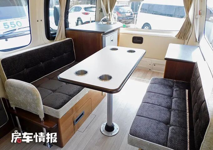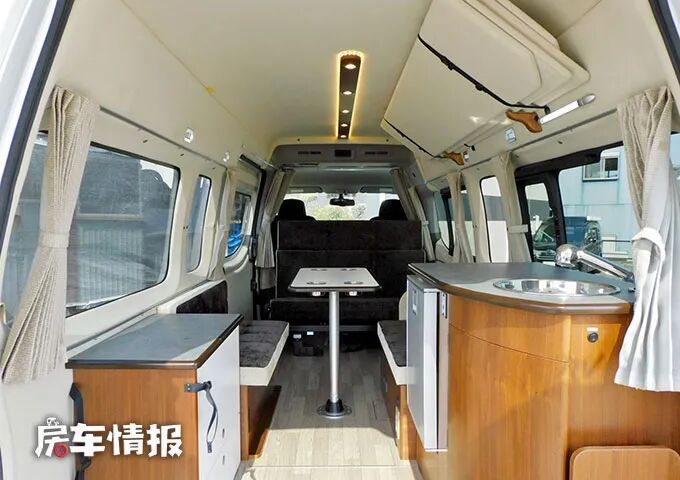 进入车厢内部的生活区,第一感觉特别的通透,虽然从外观上看窗户都是黑色,而且看不到里面,但是从里面看外面却非常的清楚和透亮,这样的设计,就算B型房车自身的空间偏矮小,也不会因此显得特别的压抑,反而能够增大视觉空间感。