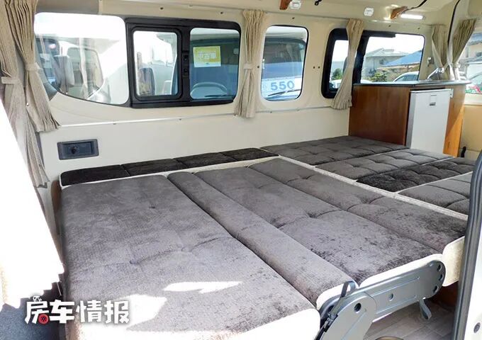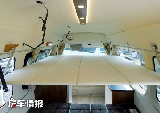 接下来看一下这款房车的与众不同之处,就是在车厢顶部有一个可折叠的床铺,平时不用的时候就紧贴着车顶的一侧折叠放置,使用的时候就可以展开形成一张双人床,设计非常新颖而且也充分的利用了“大篷车”内部空间较高的特点。