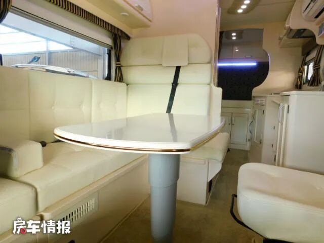 驾驶室的后方是生活区,提供了一张L型的皮质全包沙发,中间的餐桌是可升降的,晚上需要休息时,可以将餐桌下降,和沙发拼接成一张尺寸为1900*1300(mm)的双人床,能够容纳两名成年人休息。