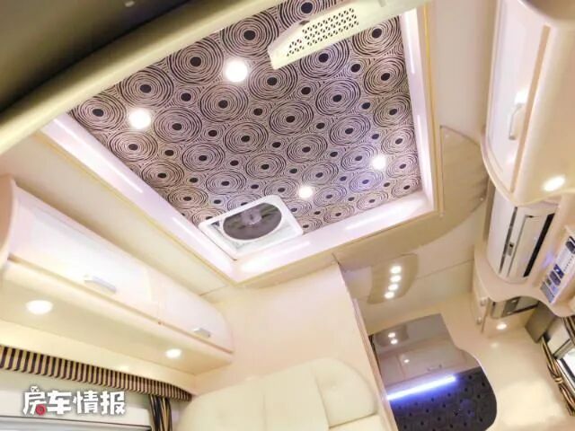 进入车厢内部,主调的象牙白色不仅彰显了豪华和大气,而且又搭配了极其少女心的马卡龙粉色,乘客门的上方是一台家用空调,控制着生活区的温度。空调下方是全车的水电控制平台。
