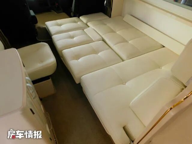 说回这款房车,它是基于日野的中巴车底盘改造的,外观是一款类似于B型房车但实际上是一款C型房车,全车的长宽高尺寸为5995*2200*2970(mm),外观的颜色为奶咖色,前部的车窗被加宽并与后部和车顶集成在一起,从而增大了内部的生活区使用空间,同时也减轻了全车的重量。
