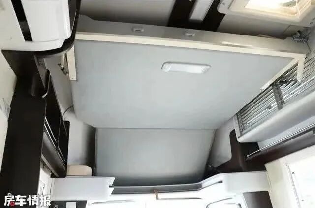 由于前额头的设计方式比较低,所以没有采用固定式的额头床,而是通过液压支撑杆的连接,悬挂了一张可以折叠的吊床。这张双人床展开后尺寸为2000*1350(mm),相比一般的额头床更加宽大,躺上两名成年人毫无压力。另外车顶还单独配置了照明灯和换气扇,降低睡卧时的压抑感。