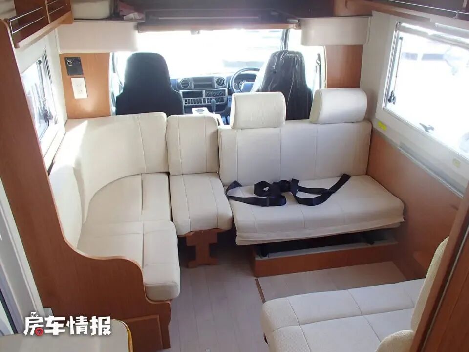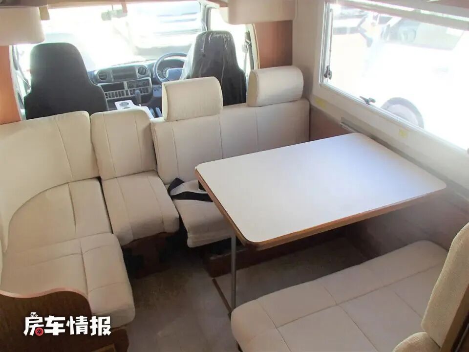 对坐沙发在白天的时候可以全部向前乘坐,其中两个座椅带有安全带,行车时可以乘坐。沙发中间是一张可折叠的餐桌,晚上休息时,可以将餐桌折叠,将对坐沙发拼接成一张1900*1040(mm)的沙发床。