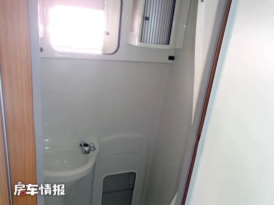 厨房区对面是一间独立的卫浴室,众所周知,日本的房车大部分不提供盥洗设施,所以这在日本的房车中算是高配备了,卫浴室里提供了淋浴喷头、梳妆镜、洗手池等洗漱设备,并预留黑水箱舱门可以选装抽拉式马桶替换原车所提供的便携式马桶,基本可以满足日常起居的需求。