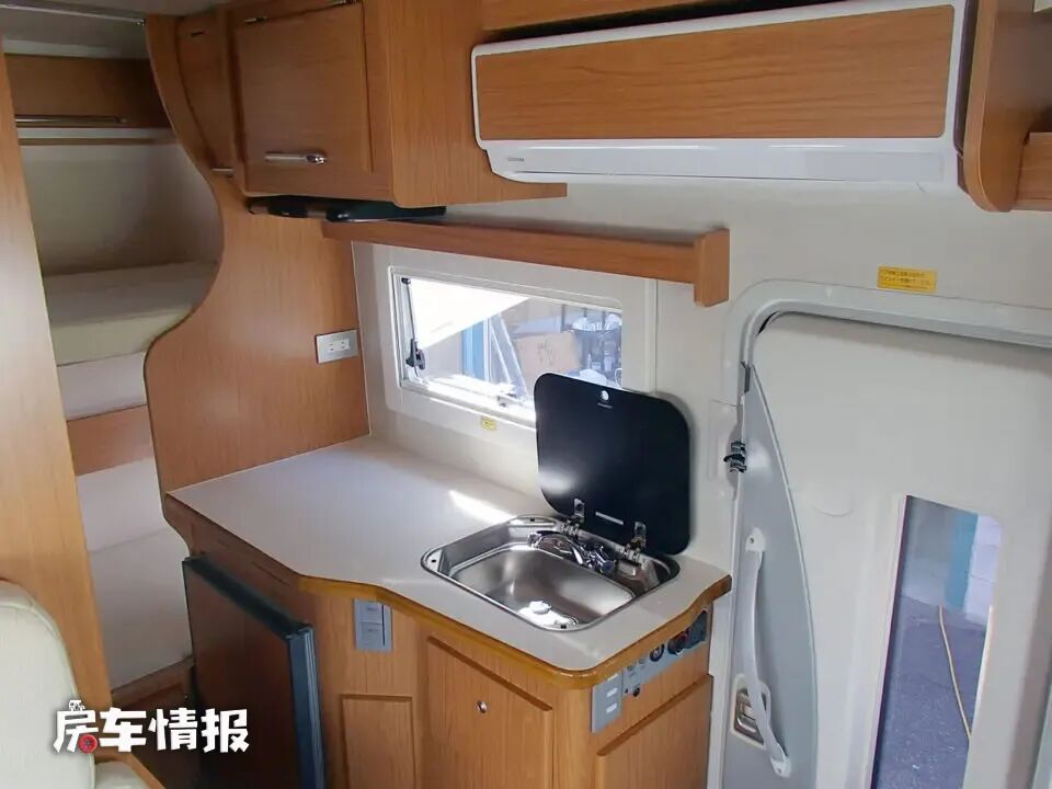 乘客门右侧是厨房区,配置了一个带盖的洗菜池、80L车载冰箱和房车专用抽油烟机,后期也可以在左边空置的台面上安装便携式燃气灶,台面上方的储物吊柜中镶嵌了一台家用变频空调,面板使用家具同色木纹饰面,非常隐蔽也没有破坏整体的美观度。