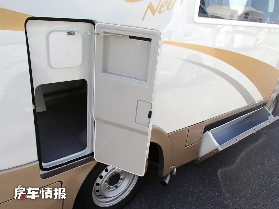这款房车是基于丰田轻卡底盘打造而成的,整车采用了铝合金轮毂的单胎设计方式,并加强了后悬挂,承载力还是可以的。全车的总尺寸为5350*2000*2800(mm),外观方方正正显得十分憨厚,前额头与驾驶室齐平,并做了圆弧形的处理,不仅降低了风阻,也提升了整体的美感。在车身右侧下方还提供了一个玻璃纤维材质的侧开门式储物舱,既美观又实用。另外,整车外观采用亮米白色,搭配棕色黄色的线条,相近色的配色让人感觉特别的舒适。