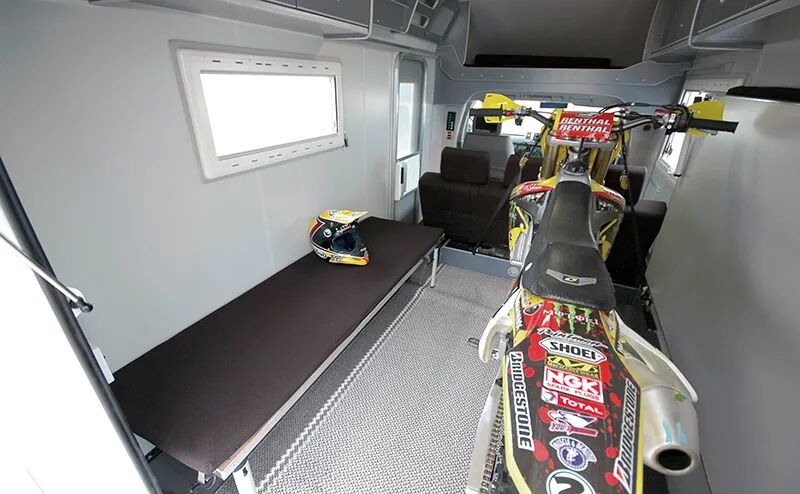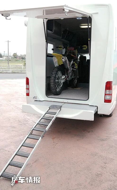 会客区后面是全车的休息区,平时的时候只有一个长条的沙发凳,但其实这个长条沙发凳是一张折叠床,旁边的空置区域可以放大件行李或是自行车摩托车,空间上也绝对足够,也能满足平时爱好骑行的朋友们。