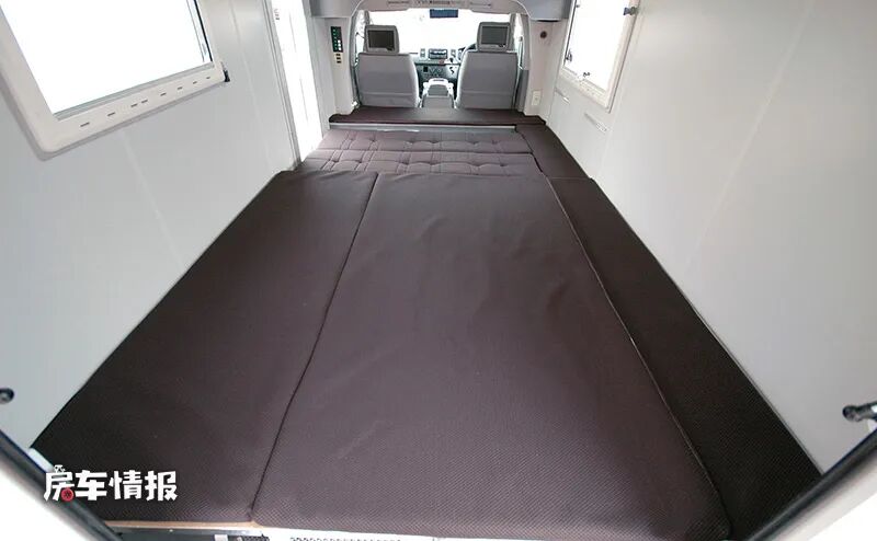 晚上需要休息的时候,将后面的折叠床打开,把前方会客区的沙发放倒,即可组合成一个贯穿整个车厢内部的超大尺寸通铺,加上额头床,这款房车最多可以给五个人提供就寝的空间,绝对不用担心没地方睡或者是睡的拥挤。