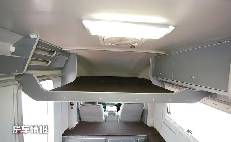 驾驶室上方是额头床,采用的是滑动推拉设计方式,晚上睡觉的时候,可以将床板拉出,增大原始的使用面积。