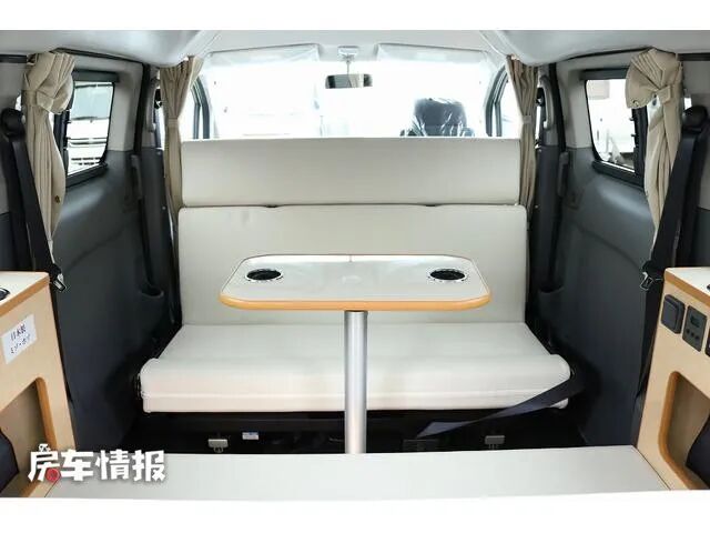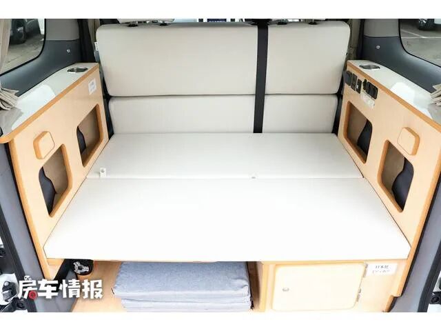 会客区后方有一块较小的床垫,既可以坐在上面休息,也可以放置物品,将前面的沙发放平之后,就可以组合成一张尺寸约为1900*1400mm的双人床,虽然有点窄,但是也能够满足两名成年人的睡眠空间。两侧还有4个空间可以放置出行物品,充分利用了车内的空间。
