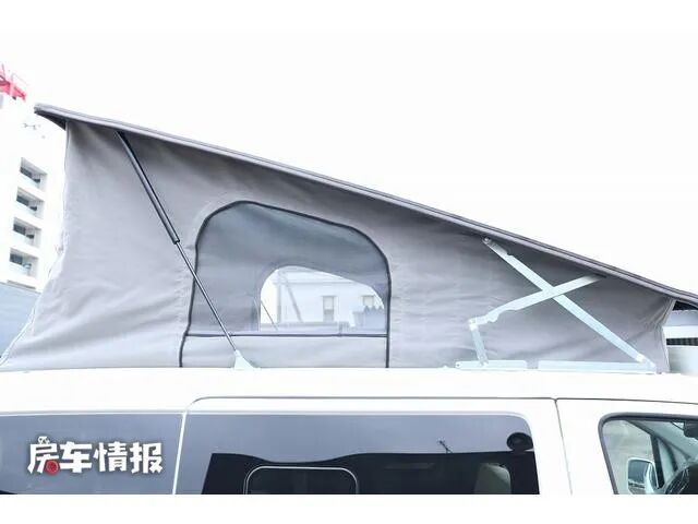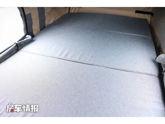 在车辆顶部,是本车的升顶区域,从车内就可以上去,里面是一张19200*1000mm的双人床,两名成年人可以放心的睡在里面,周围三面还有可开关的隐私帘,既可以通风换气又可以增加内部光照,睡在里面一点都不会觉得压抑。
