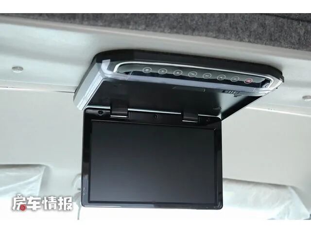 驾驶室后方有一个翻折式的电视机,既可以在会客区看电视,同时倒车影像也连接到了电视上,驻车时也可以看到车后的景象,十分方便。