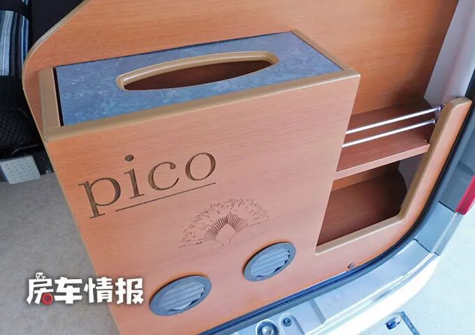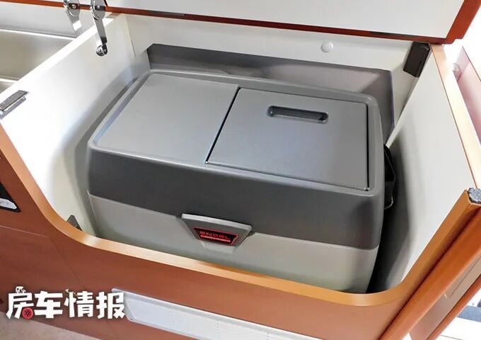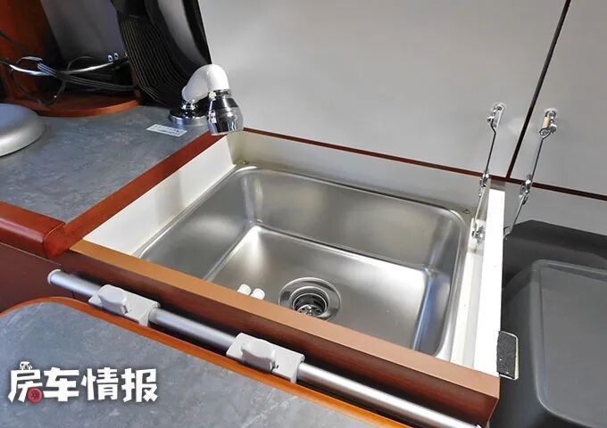 沙发座椅的对面是一个小型的橱柜,厨台上面有一个带有桌面翻盖的不锈钢水槽,尺寸还是挺大的,平时盖上盖子可以充当案板,需要洗菜洗手就将翻盖打开。另外一边翻起盖板,可以看到一台14L的迷你小冰箱,虽然储存不了多少食物,但有总比没有要好一些。