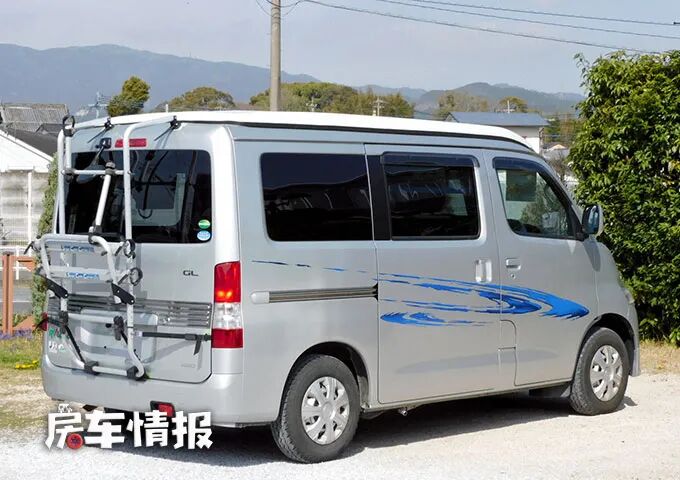 与家用车不同的是,这款房车的顶部带有升顶机构,车尾部还带有爬梯和自行车架,平时可以装配一辆自行车。