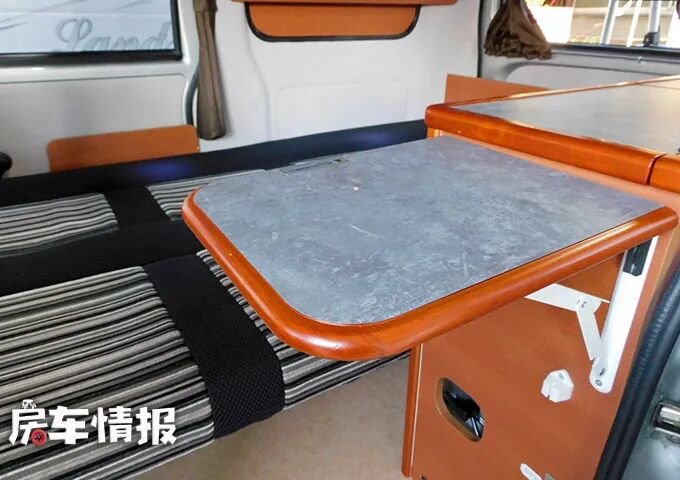 车厢的一侧提供了一整排的沙发座椅,座椅前方提供了一个小型的餐桌,平时白天可以坐在上面就餐小憩,晚上需要休息的时候,需要将餐桌降下,把整排沙发座椅打开放平,变成一张小型的双人床,平时能够容纳两个人休息使用。