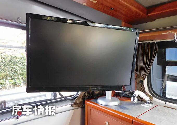 在这个橱柜上面,还有一台19英寸的液晶电视机,平时驻车的时候可以坐在沙发上看电视,电视可以随意转动角度,非常的人性化。