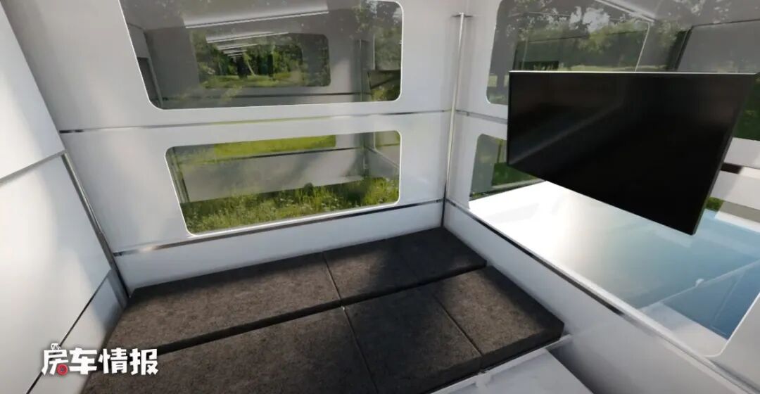 按下按钮就会将藏匿在后备箱中的“房间”拓展打开,平时它是以折叠的方式存放的,占用了非常小的一部分空间,打开之后就可以看到了这个房间的全貌。