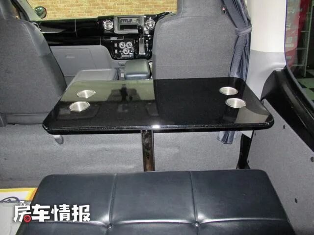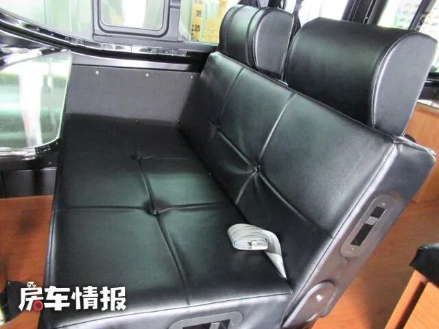 驾驶室后排是一个小型的会客区,提供了一排双人沙发座椅和一个可升降的餐桌,虽然餐桌距离座椅之间的距离很狭窄,但是好在座椅全部采用皮质软包的工艺,也能相对缓解乘坐的疲劳感。晚上需要休息的时候,也可以将这排沙发座椅展开临时搭建一张沙发床。