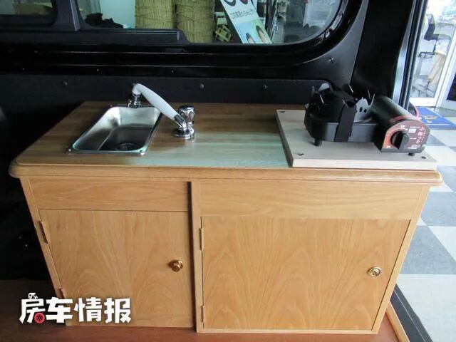 沙发床的对面是一个小型的橱柜,尺寸虽然不大,但还是提供了一个小型的不锈钢水盆和一个便携燃气灶,中间空置的部分台面还可以用来切菜,基本可以满足简单的做饭需求。