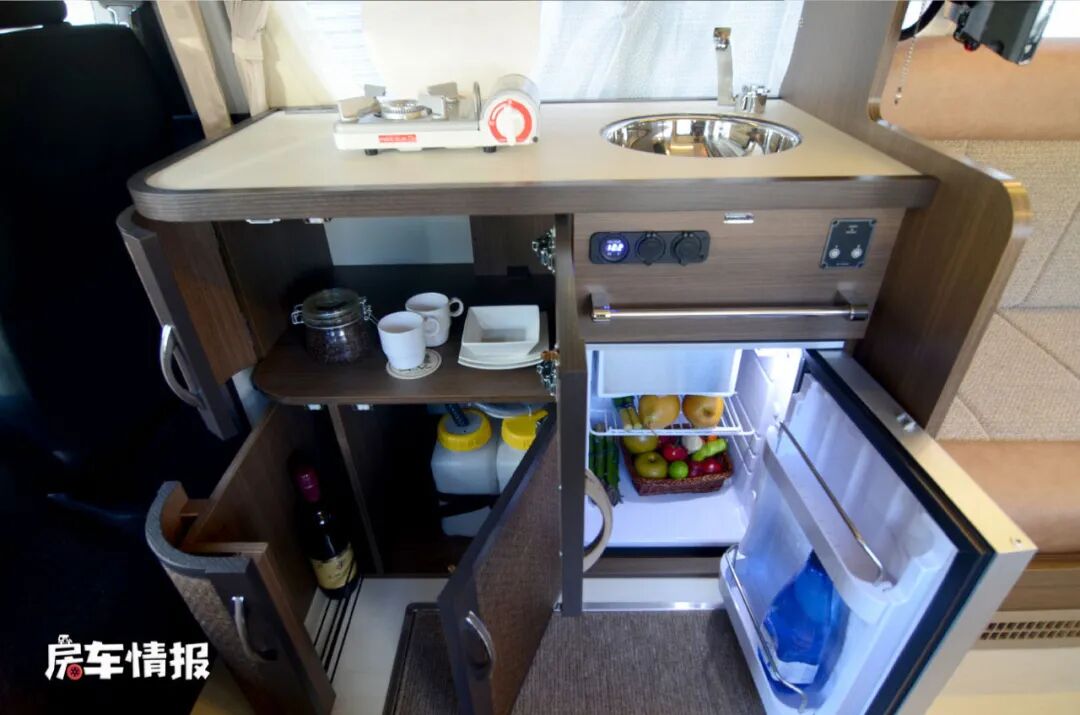 乘客门正对的是厨房区,台面上方提供了便携式燃气灶和不锈钢水槽,下方提供了储物空间以及一台49L的单开门的冰箱,空间虽然不大,但是放一些易腐烂的食物还是没有问题的。