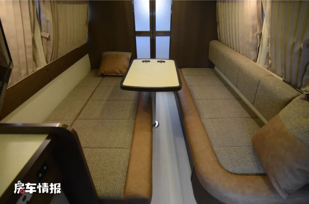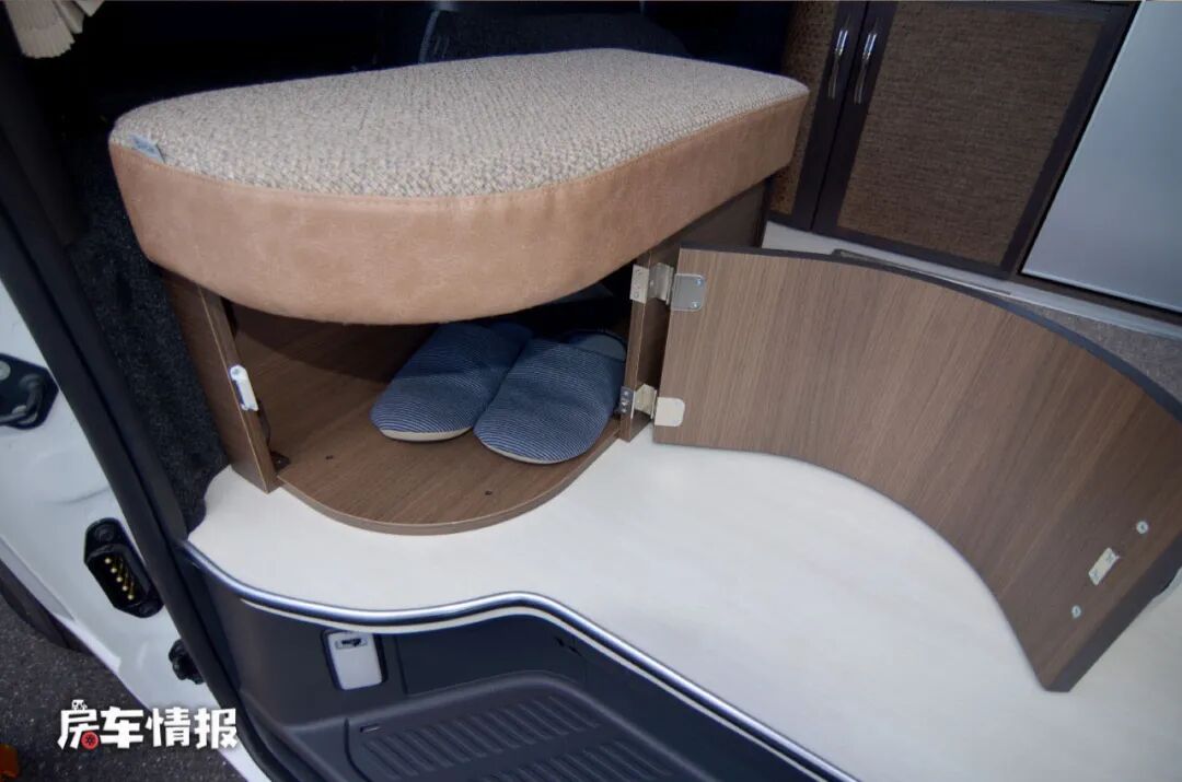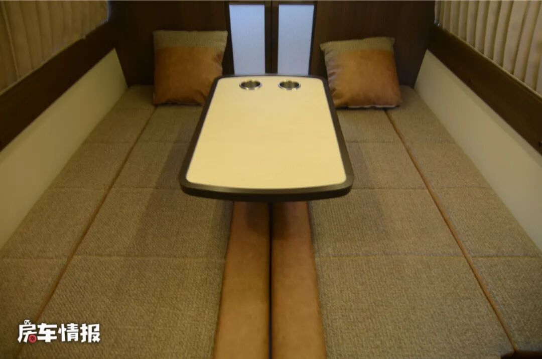 乘客门进门处有一个小型的圆弧形坐塌,坐垫下方是一个小型的鞋柜,圆弧形的设计不仅防磕碰,而且也十分美观。整车还提供了一张可移动的小餐桌,平时做饭需要存放准备食材时就可以放置在坐塌前方,不需要时则可以放到会客区使用。
